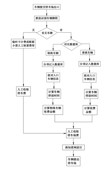 “出口系統(tǒng)”主要由ZQQM高清車牌識別設(shè)備、拍照補(bǔ)光設(shè)備、終端管理設(shè)備、數(shù)據(jù)傳輸設(shè)備及應(yīng)用軟件等組成。主要作用為記錄出口車輛的全部信息、比對車輛數(shù)據(jù)庫車輛性質(zhì)、比對入口車輛數(shù)據(jù)庫收取停車費(fèi)、內(nèi)部車輛的無障礙通行、無牌照車輛刷卡通行。